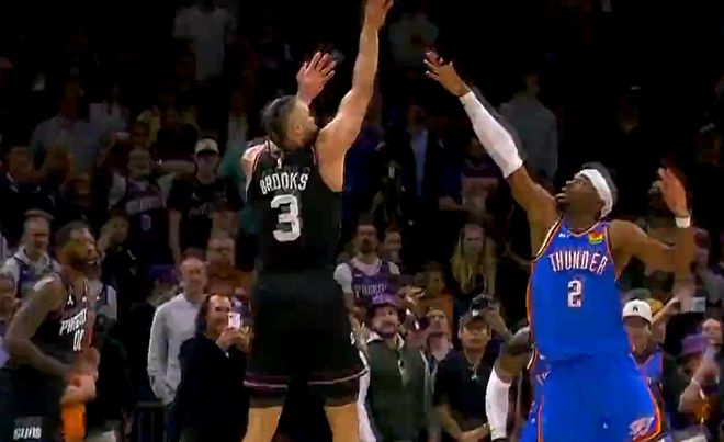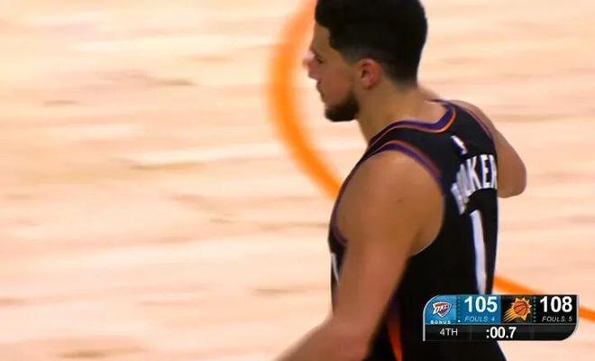 最后8.2秒,奥尼尔成功解决了世界性难题——边线发球。布克接球后,手握雷神之锤,面对雷霆俩个疯狗式防守的卡鲁索和多特,3分线外强行干拔,一剑封喉,绝杀雷霆。