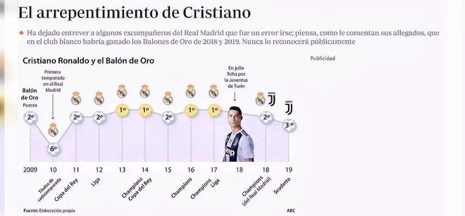 2019年12月,西班牙第3大报刊《ABC报》:C罗已后悔加盟尤文图斯