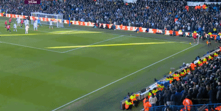 所以在第35分钟,是利兹联通过前场的定位球二次进攻,在约罗身前抢到落点,从而击中了球门,打出了真正的好机会:
